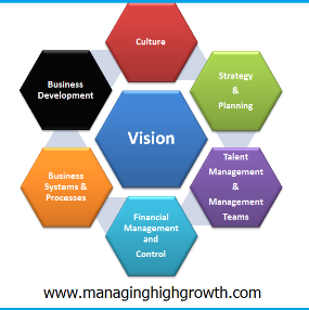 Vision, Culture, Strategy and Planning, Talent Management, Financial Management & Control, Business Processes and Business Development. The first are about leadership and infrastructure. The other 5 look at key business activities but will be much more effective if the infrastructure is in place.